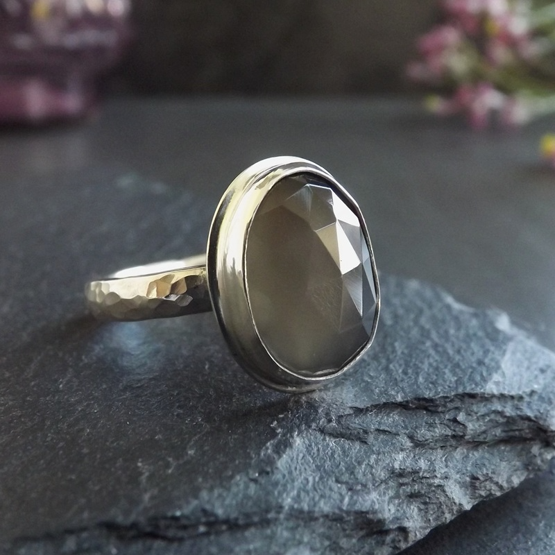 A stunning large black moonstone wrapped in silver and set on a chunky hammered silver statement ring.