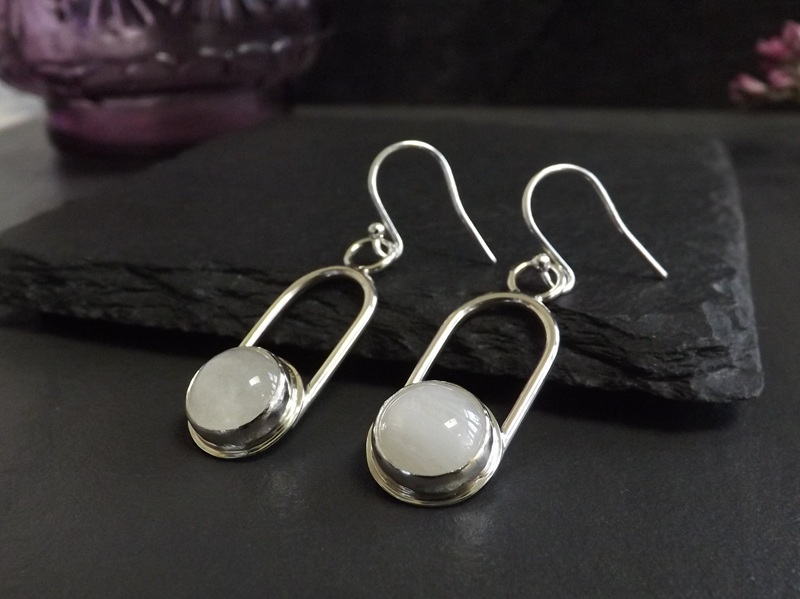 Stunning rainbow moonstones wrapped in silver, like balls of captured moonlight glowing iridescent white, with blue flashes that appear as they move. The curve of an arch represents an entranceway, a point in a journey, and the open ends symbolise endless possibilities. Bridging the past with the present and what’s beyond.