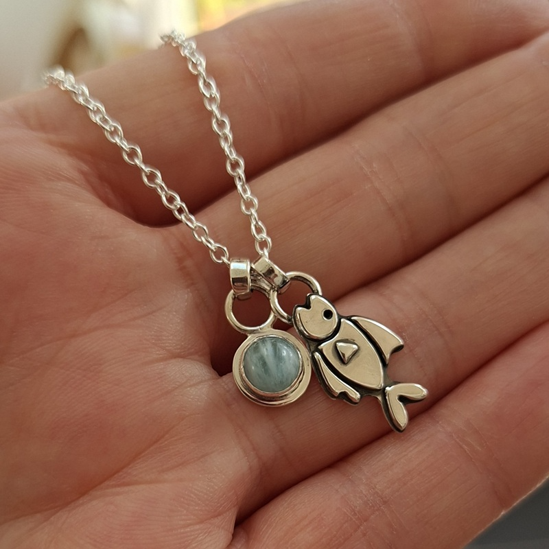 I created two separate silver charms, one with the aquamarine stone setting, and one with a unique little fish design, and hung them side by side on a silver chain. A lot of love goes into every piece of jewellery that I make. This one had an extra dash of motherly love to boot.