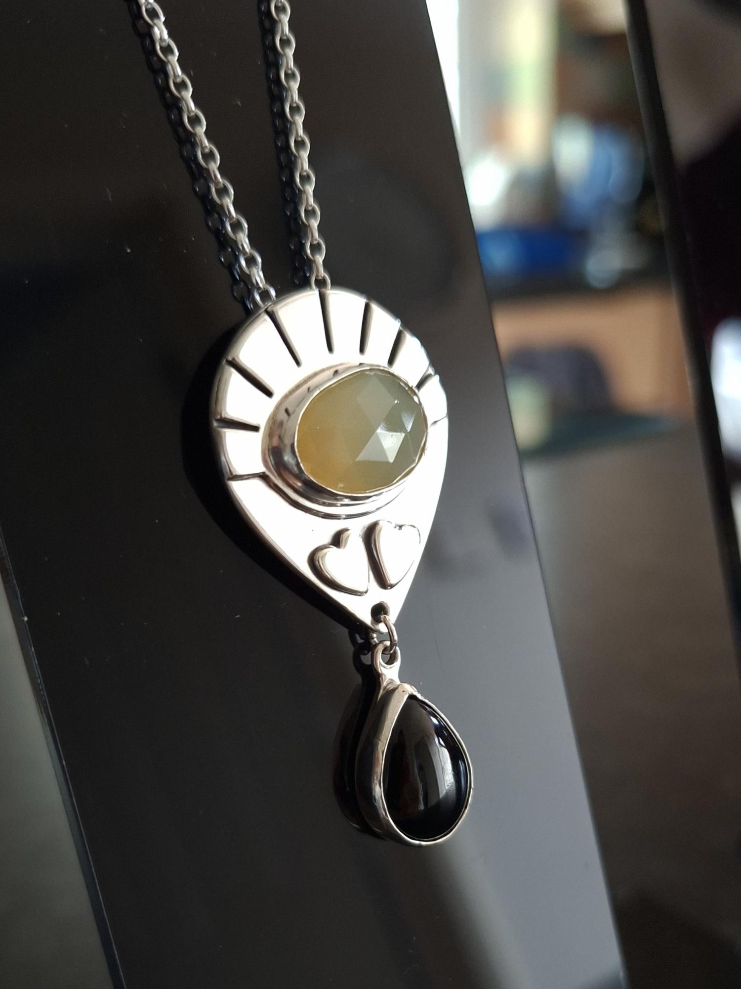 Materials: Recycled sterling silver, rose cut natural yellow opal, teardrop natural black obsidian, hung on an 18” (45cm) sterling silver belcher chain.
