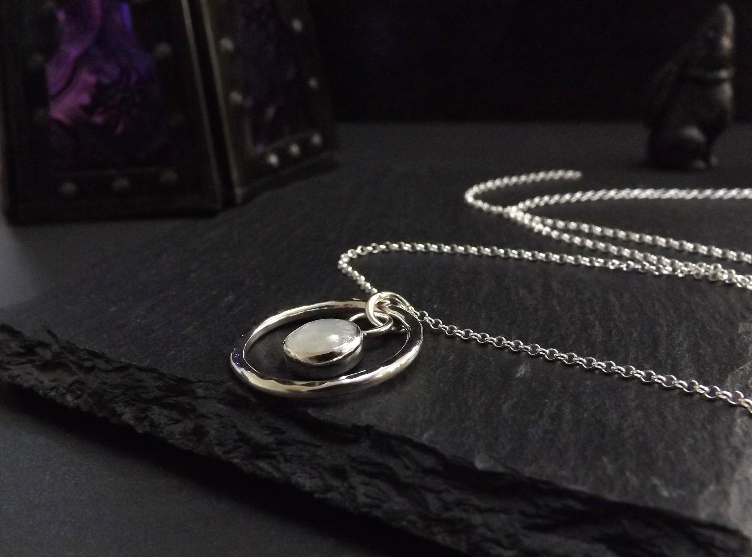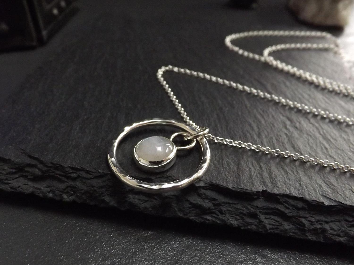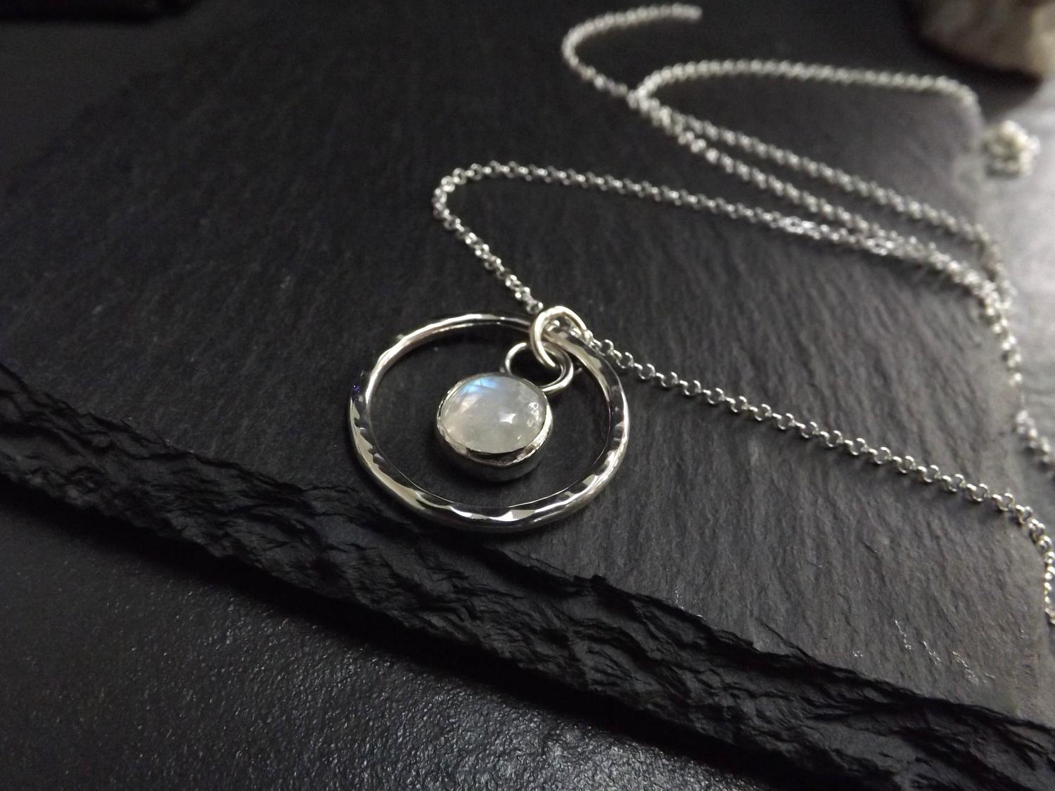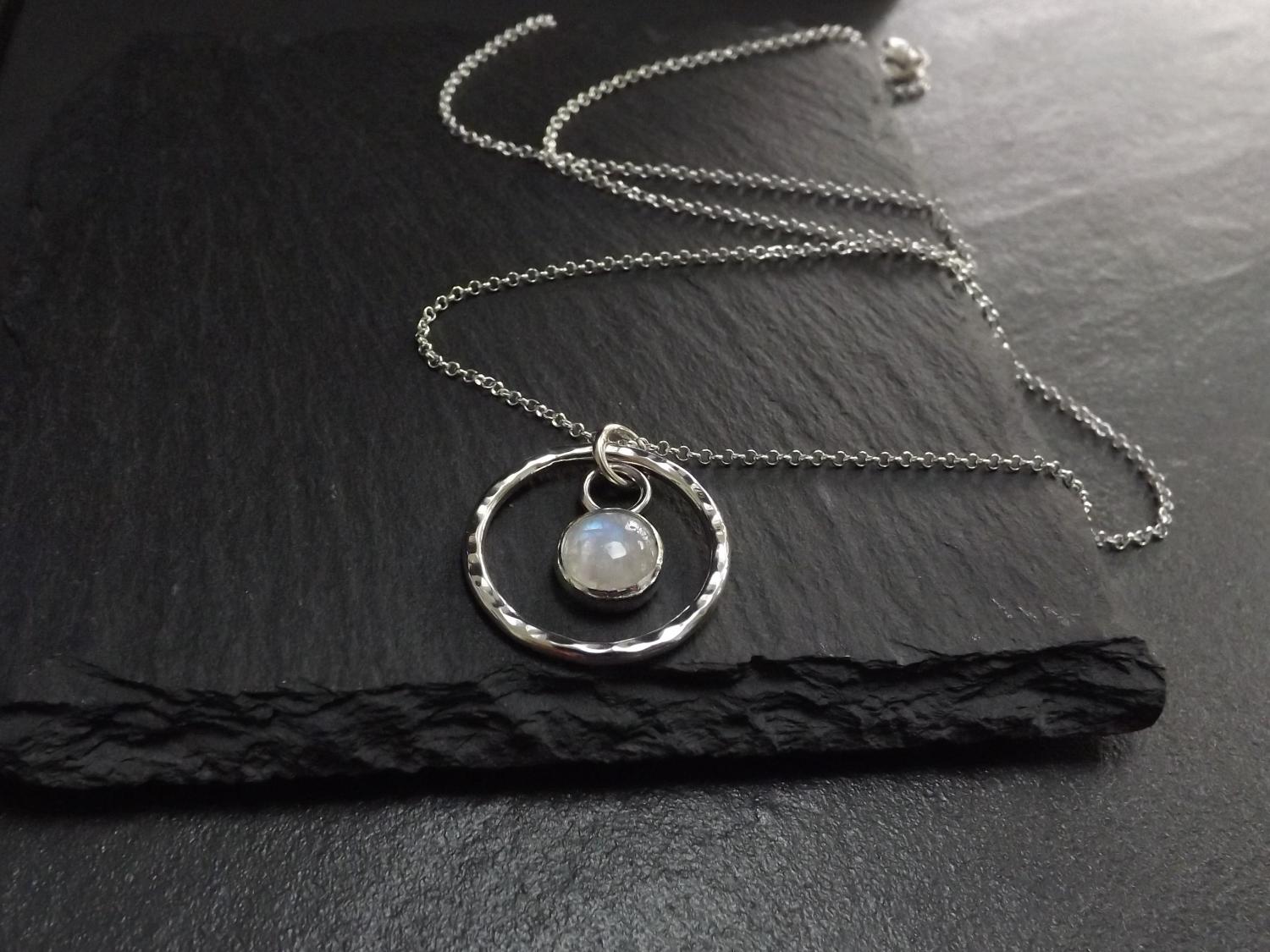 Moonstone in Hammered Silver Circle Pendant Necklace