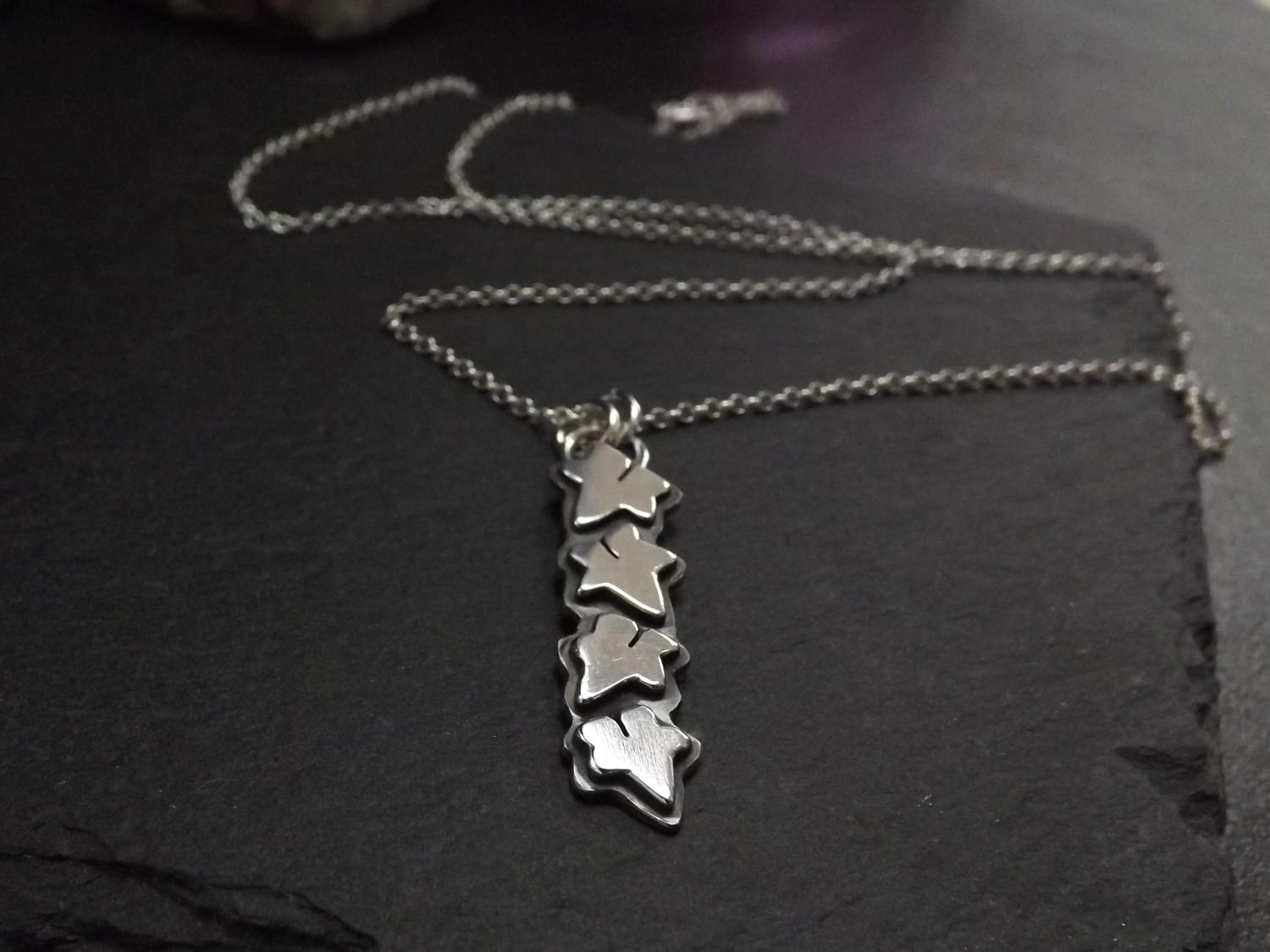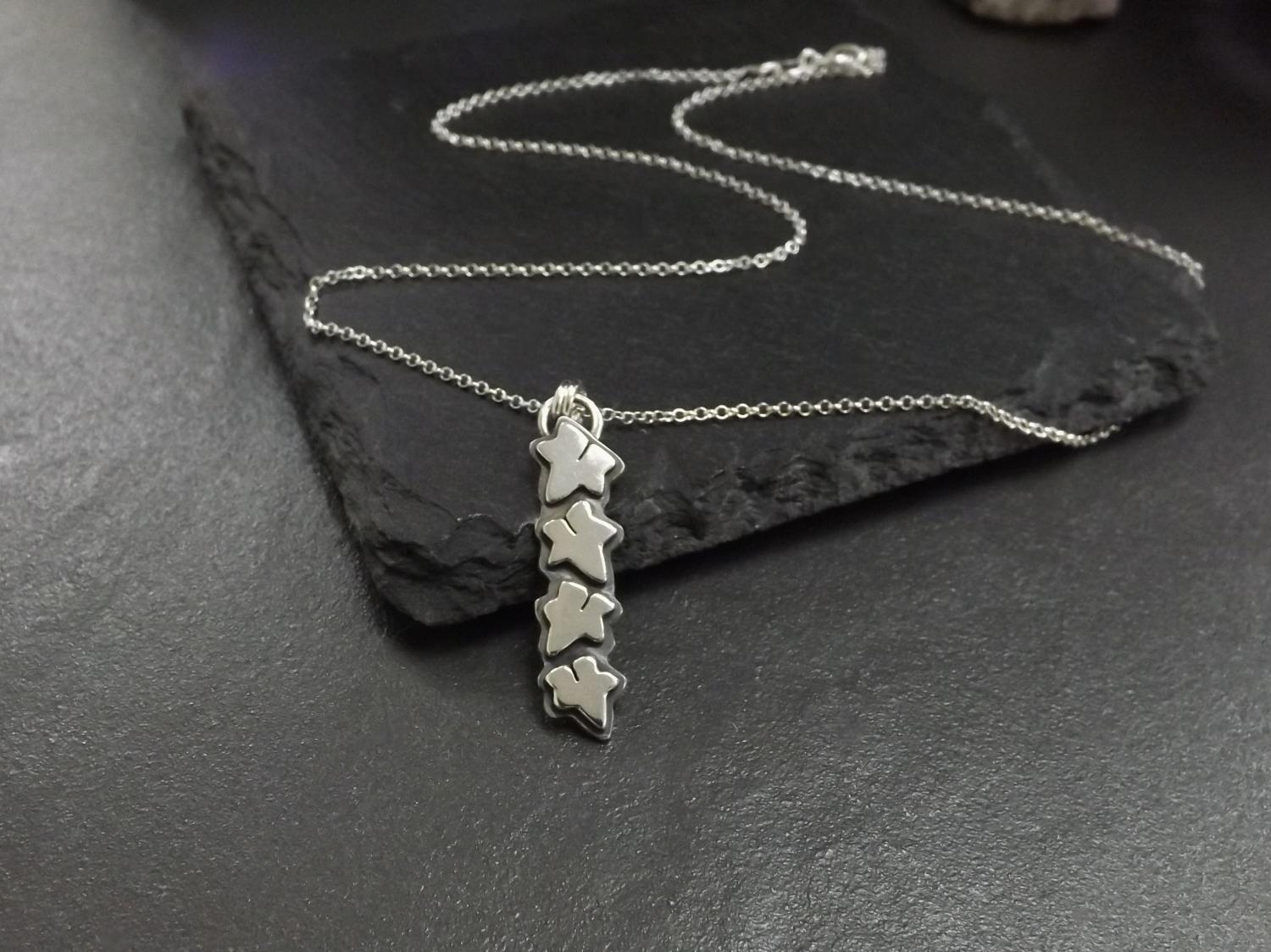 Perfect for nature lovers, this handmade silver necklace features four hand-cut silver ivy leaves, its design a modern twist on an Art Nouveau vibe. Beautiful little ivy leaves made of silver. A unique pendant on a sterling silver belcher chain. Please select your preferred chain length below.