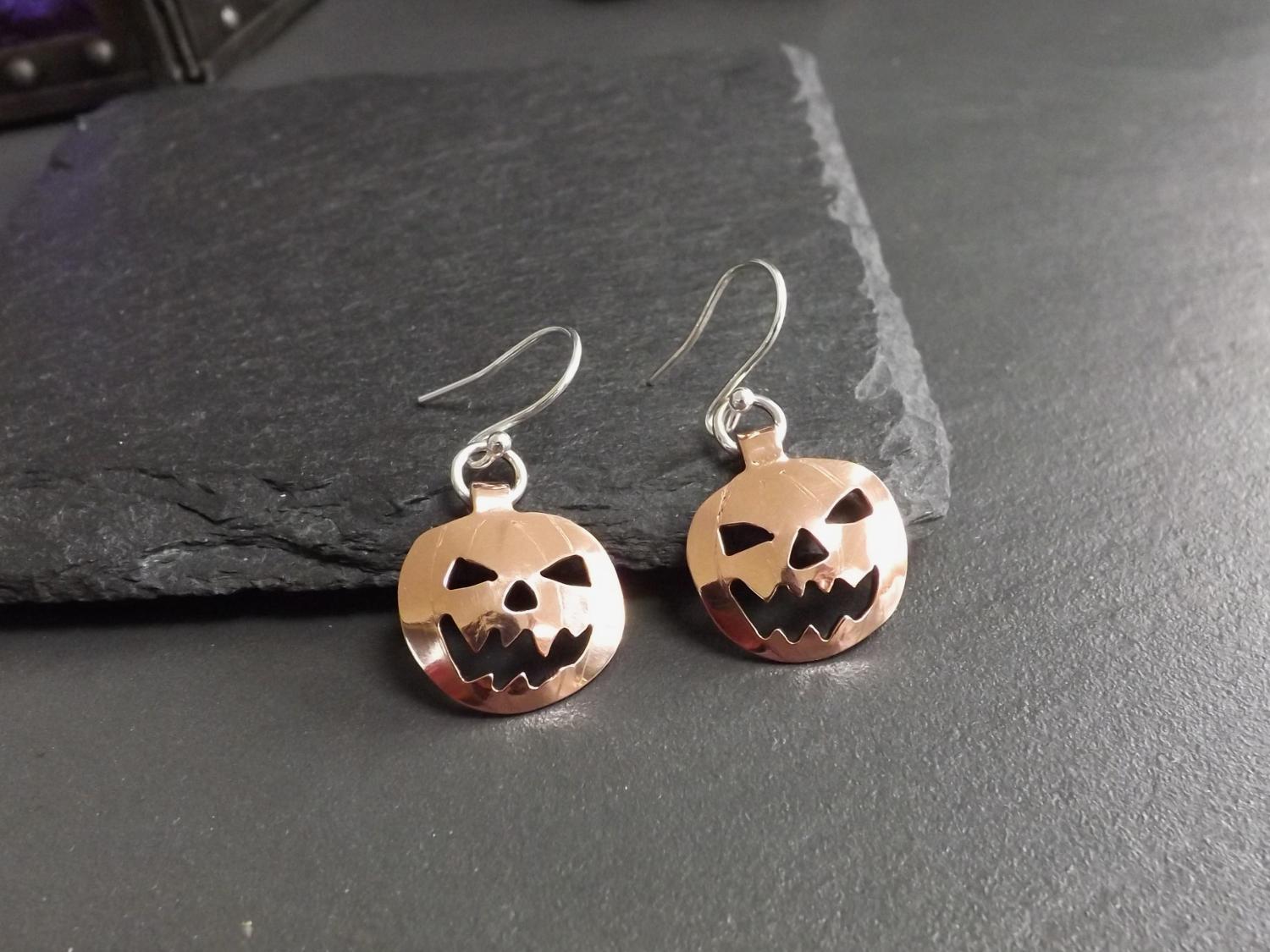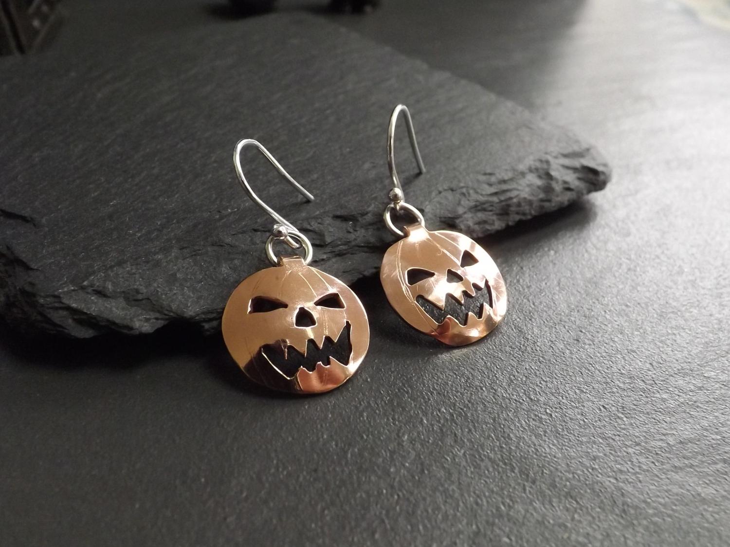 Copper Halloween Pumpkins on Silver Dangly Earrings