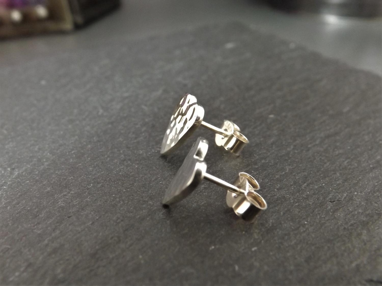 Hand made using traditional methods. The heart shapes were drawn freehand and cut from sheet sterling silver using a piercing saw. They were filed then sanded with abrasive paper to smooth the edges and remove scratches. Next they textured by hammering and then posts were soldered onto the backs before they were pickled to remove the fire scale caused by the blow torch. Finally they were cleaned and polished to give them their lovely sparkle.