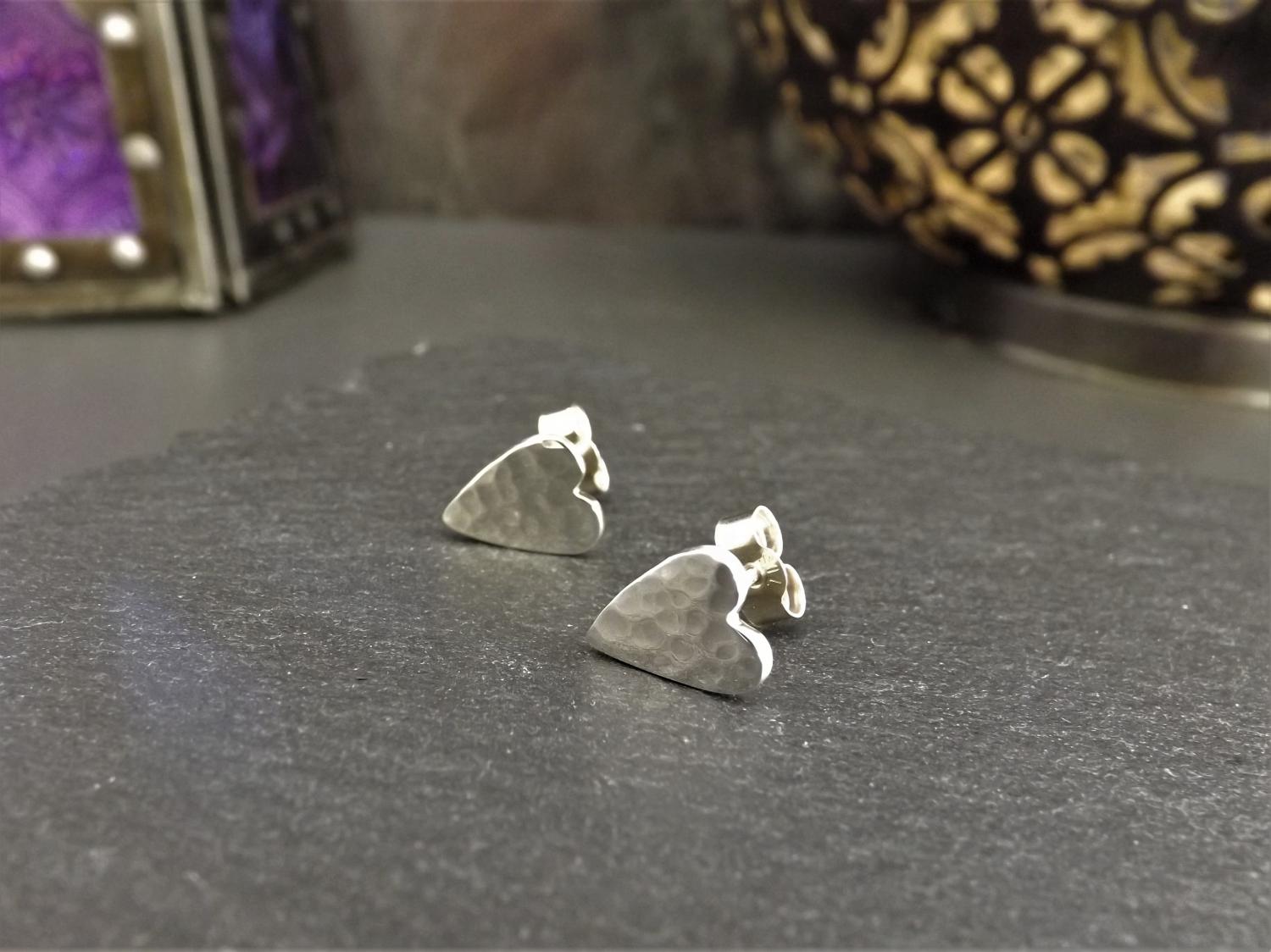 Beautiful hammered silver heart stud earrings that catch the light from every angle. Minimalist and stylish handmade hammered heart studs.