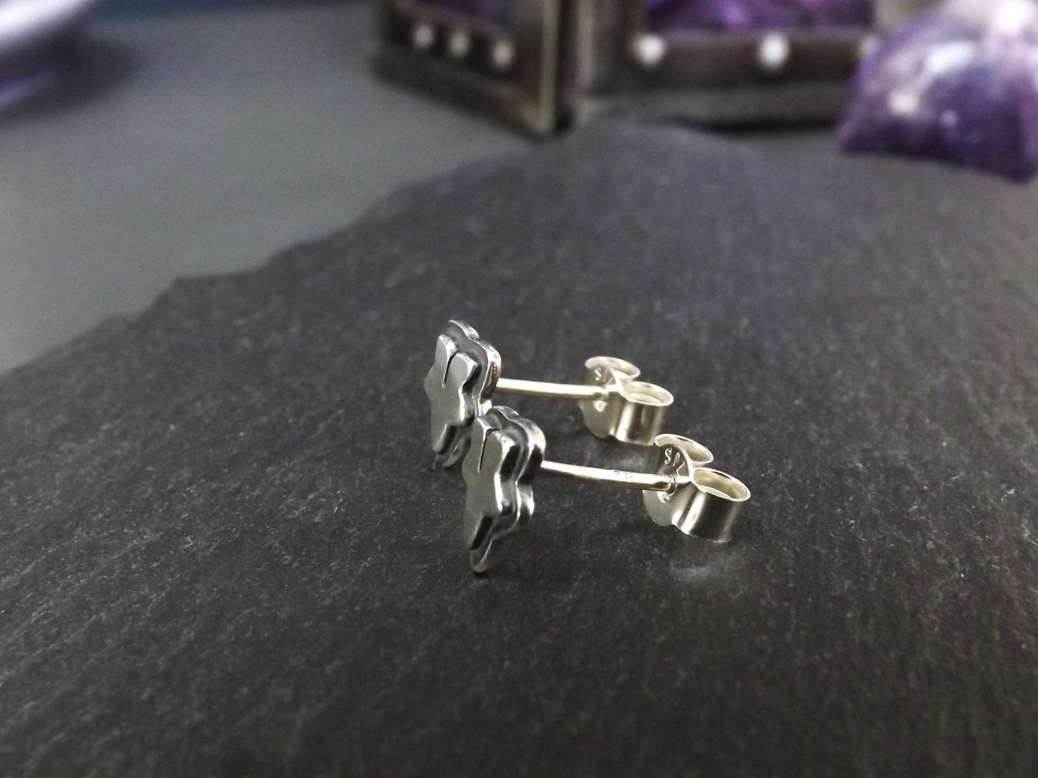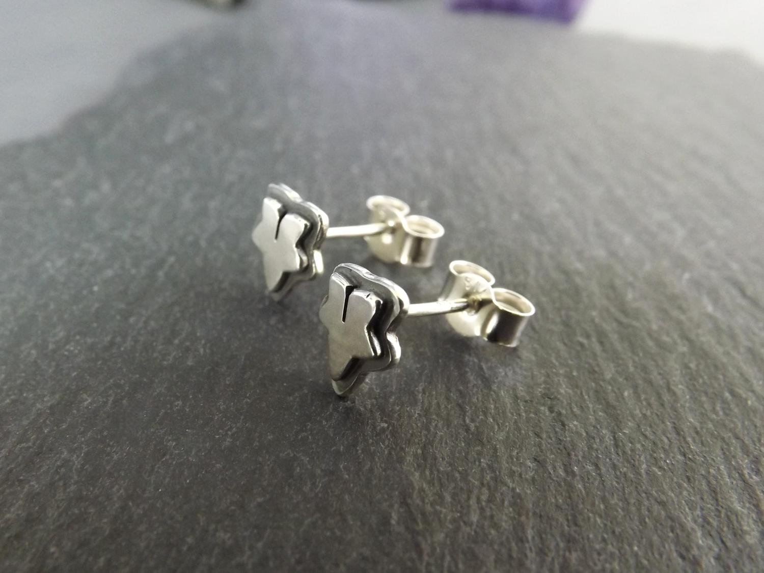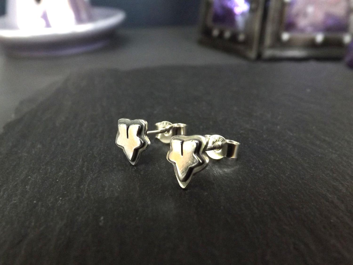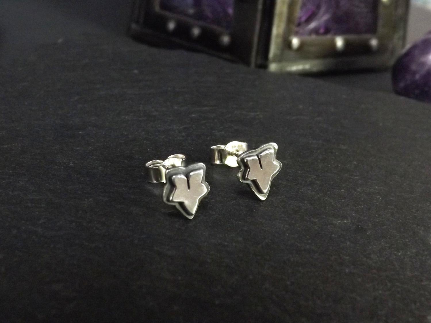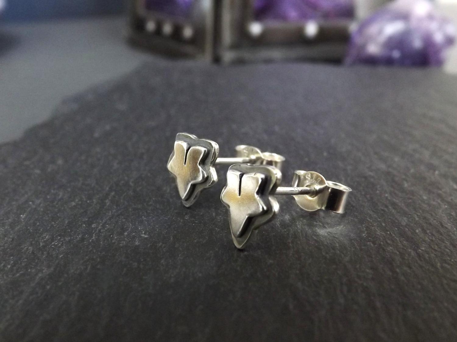 Hand made using traditional methods. The ivy leaves were drawn by hand and cut from sheet sterling silver using a piercing saw. They were then filed and sanded with abrasive paper to smooth the edges and remove scratches. The little leaves were then soldered onto a second sheet of silver, and then cut around, and again filed and sanded to smooth the edges. Posts were soldered to the backs and then the pieces were placed in a warm pickling solution to remove the fire scale caused by the blow torch. Next they were cleaned and patination was added to darken the back plates and make the relief design stand out. Finally, the leaves were polished to give them a lovely shine.