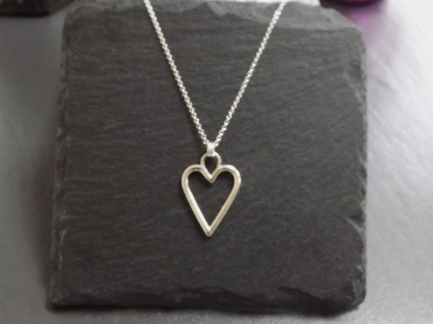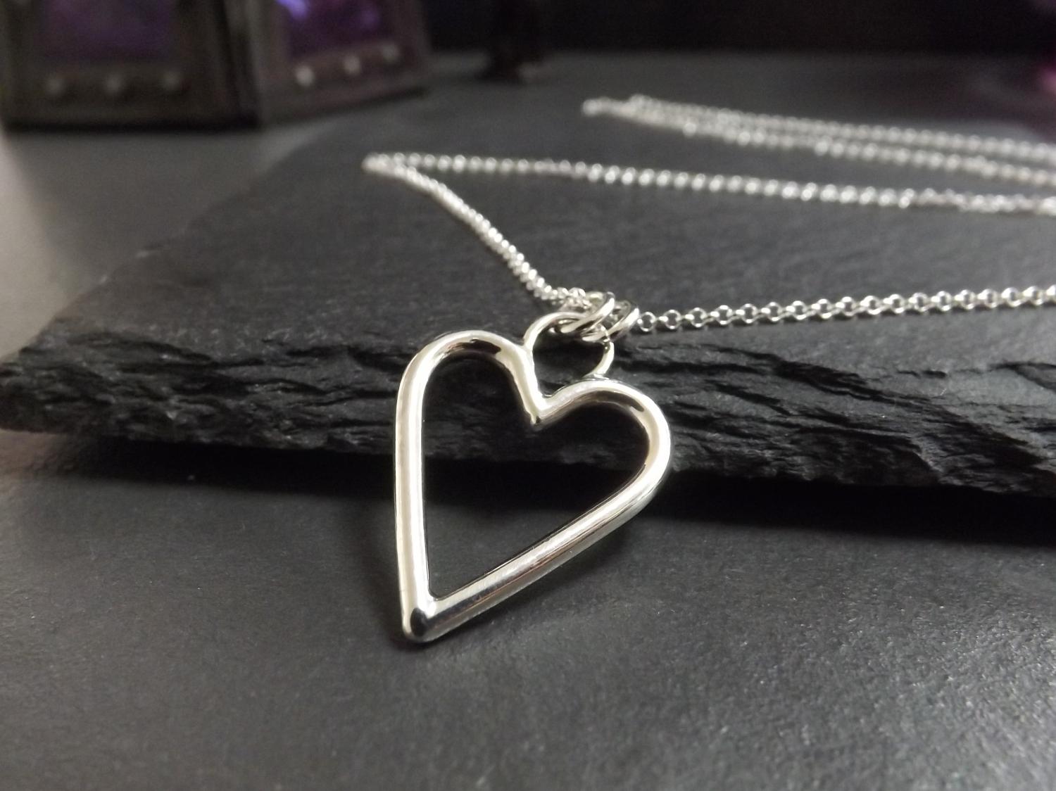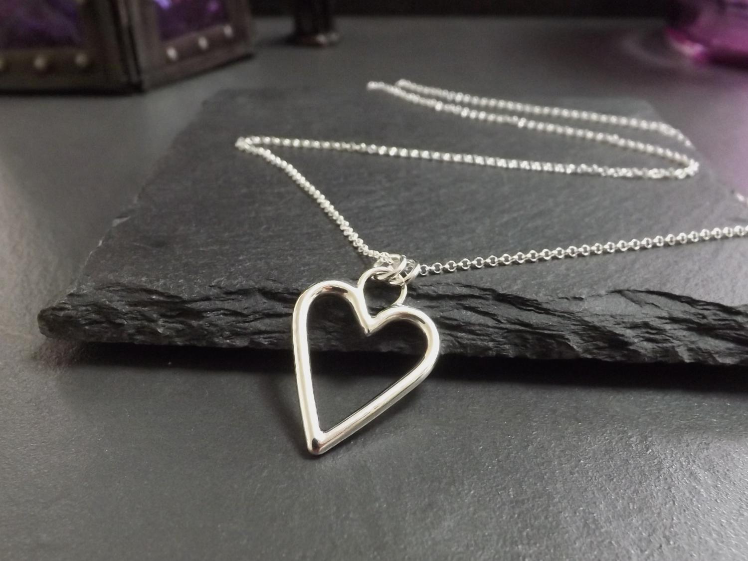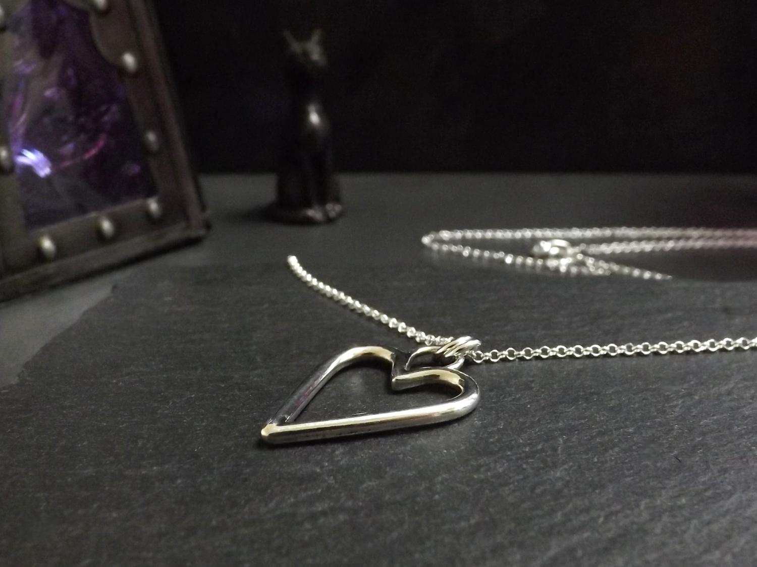 Handcrafted using traditional silversmithing techniques. The heart was formed from a length of thick sterling silver wire, cut into two pieces then shaped to make the two halves of the heart and then soldered together. A smaller curved piece of wire was then soldered to the top. The piece was placed in a warm pickle solution to help clean it and remove any fire scale caused by the blowtorch. The pendant was then filed, sanded and polished before adding jump rings and hanging it on its chain.