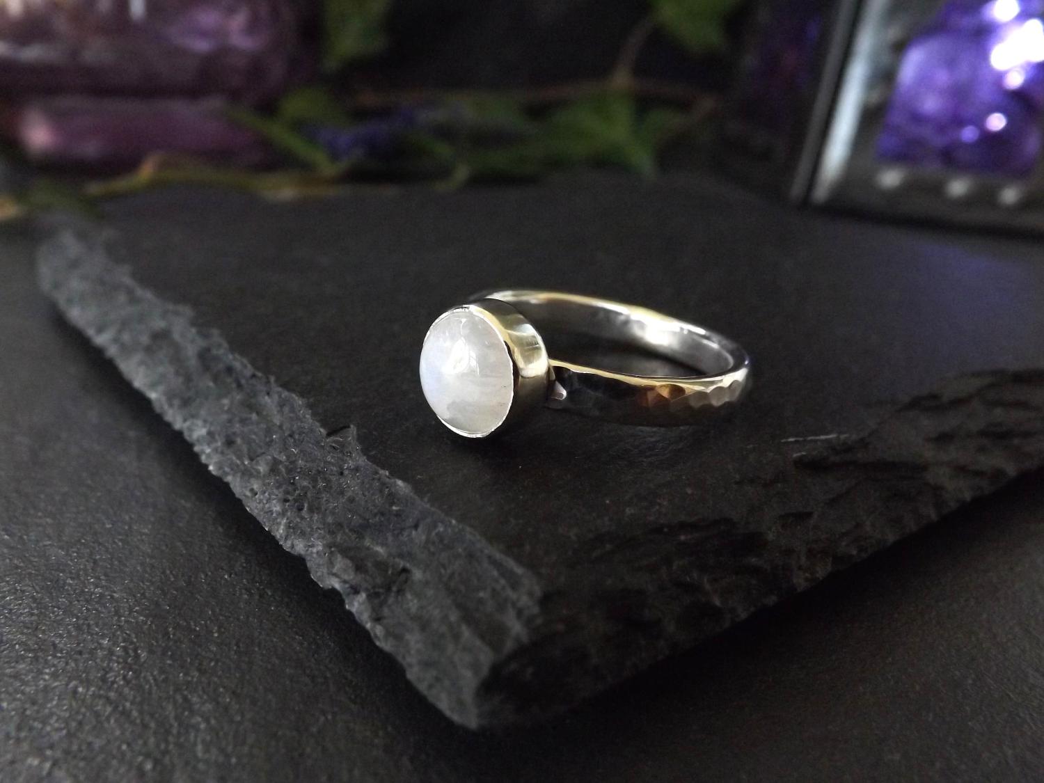 Hand made using traditional methods. The ring was formed from a length of oval shaped sterling silver. The stone setting was created by fitting a strip of fine silver bezel around the moonstone to make the walls the perfect size and shape for the stone. This was then soldered to a sheet of sterling silver to make a cup for the stone to sit in. These pieces were then filed and sanded with several grades of abrasive papers to smooth all the edges and remove scratches and the cup was soldered to the ring. Then it was placed in a warm picking solution to remove the fire scale caused by the blow torch. Lots of cleaning and polishing followed to give the ring its lovely shine. Lastly the stone was placed in the cup and the silver bezel pushed over the edges of the stone to hold it in place, and the setting was burnished.