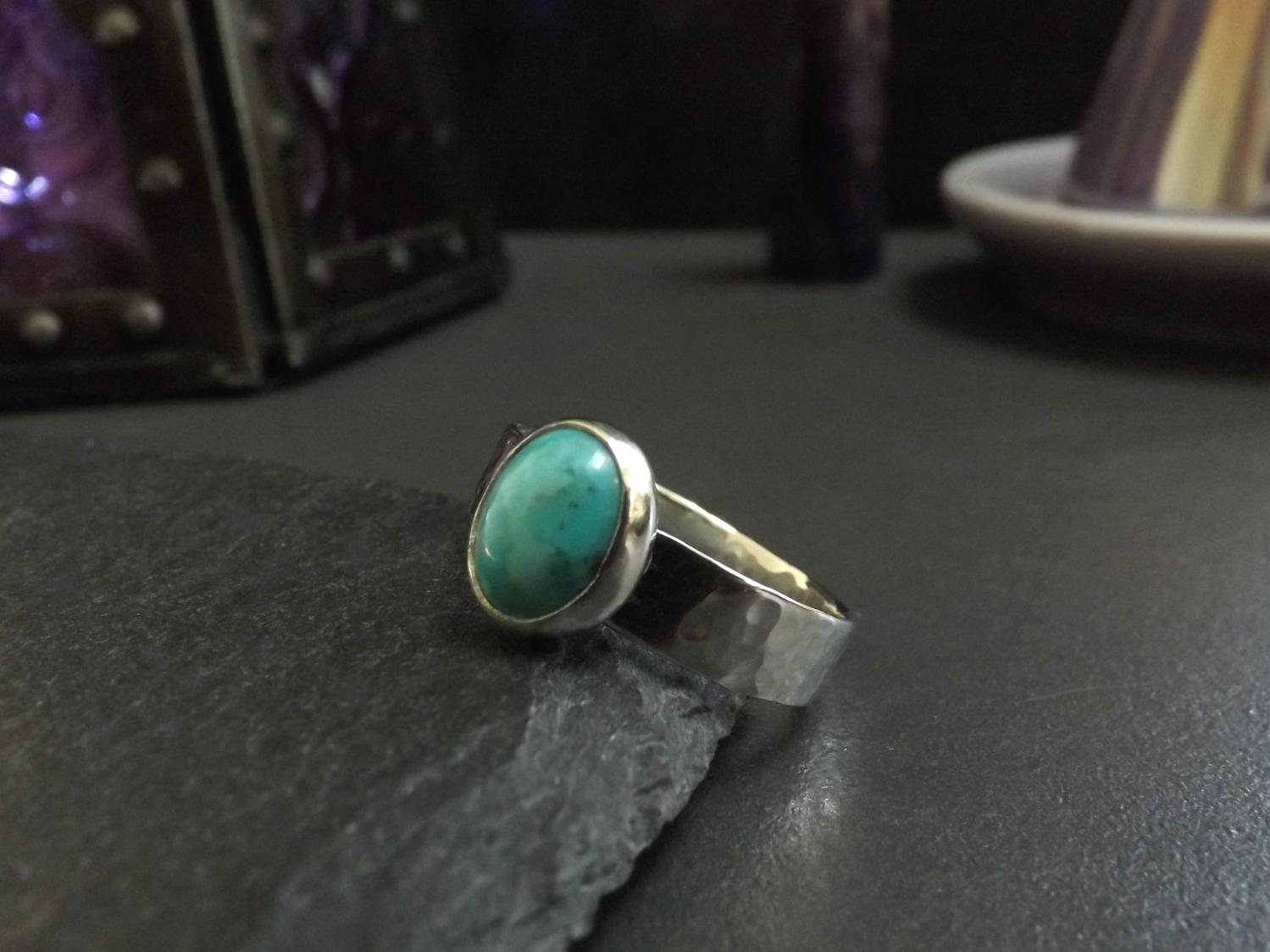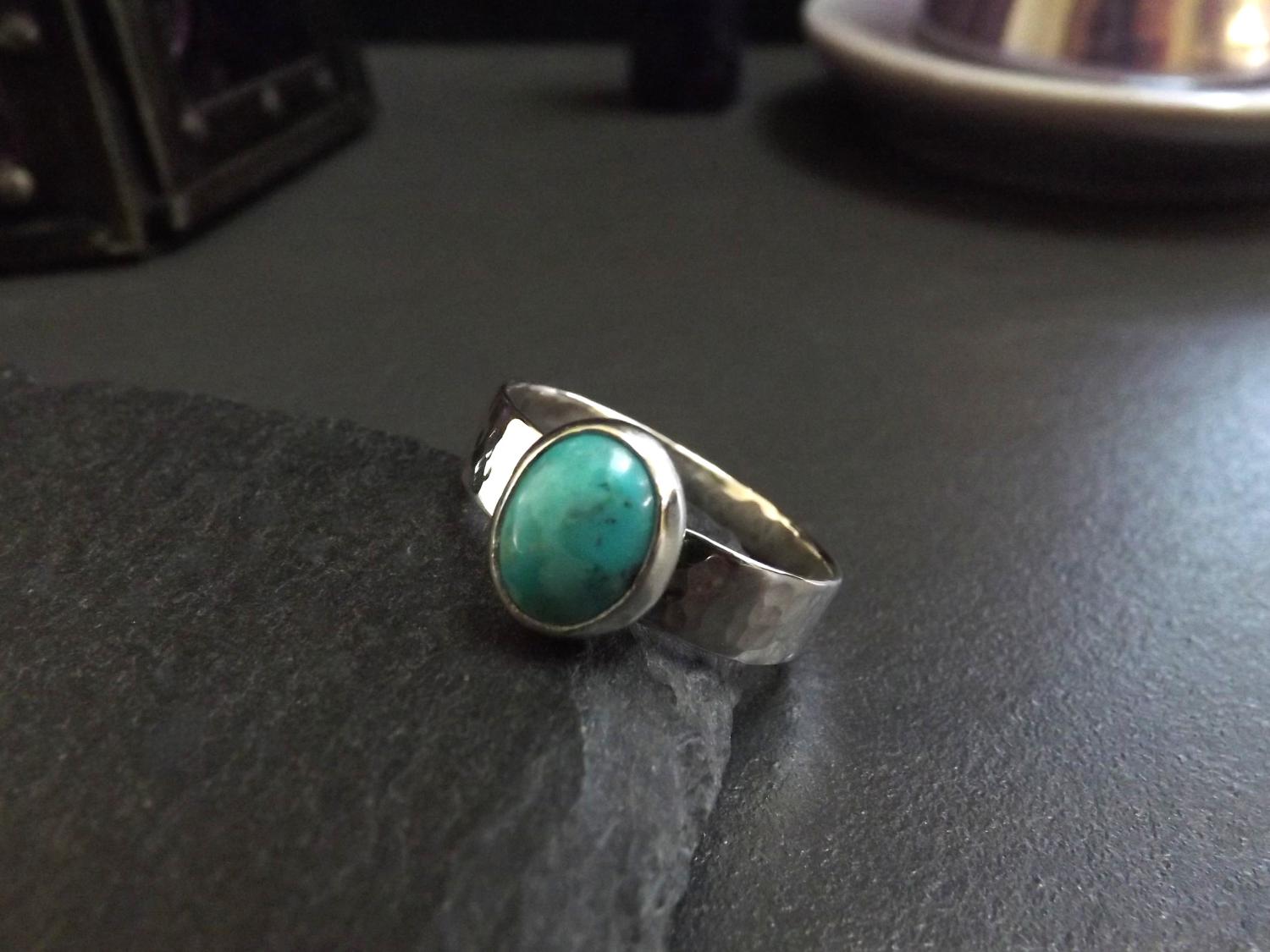 The stone setting was created by fitting a thin strip of fine silver bezel around the turquoise to make an oval which was then soldered to a sheet of sterling silver and cut around to make a cup the correct size for the stone to sit in. The ring band was formed from a strip of sterling silver and shaped over a mandrel and the ends soldered together. These pieces were then filed and sanded with several grades of abrasive papers to smooth all the edges and remove scratches. The band was textured by hammering and then the cup was soldered to the band. The ring was placed in a warm pickling solution to remove the fire scale caused by the blow torch. This was followed by cleaning and lots of polishing to give the ring its lovely sheen. Lastly the stone was placed in the cup and the silver bezel shaped over the turquoise to hold it firmly in place and then it was burnished.