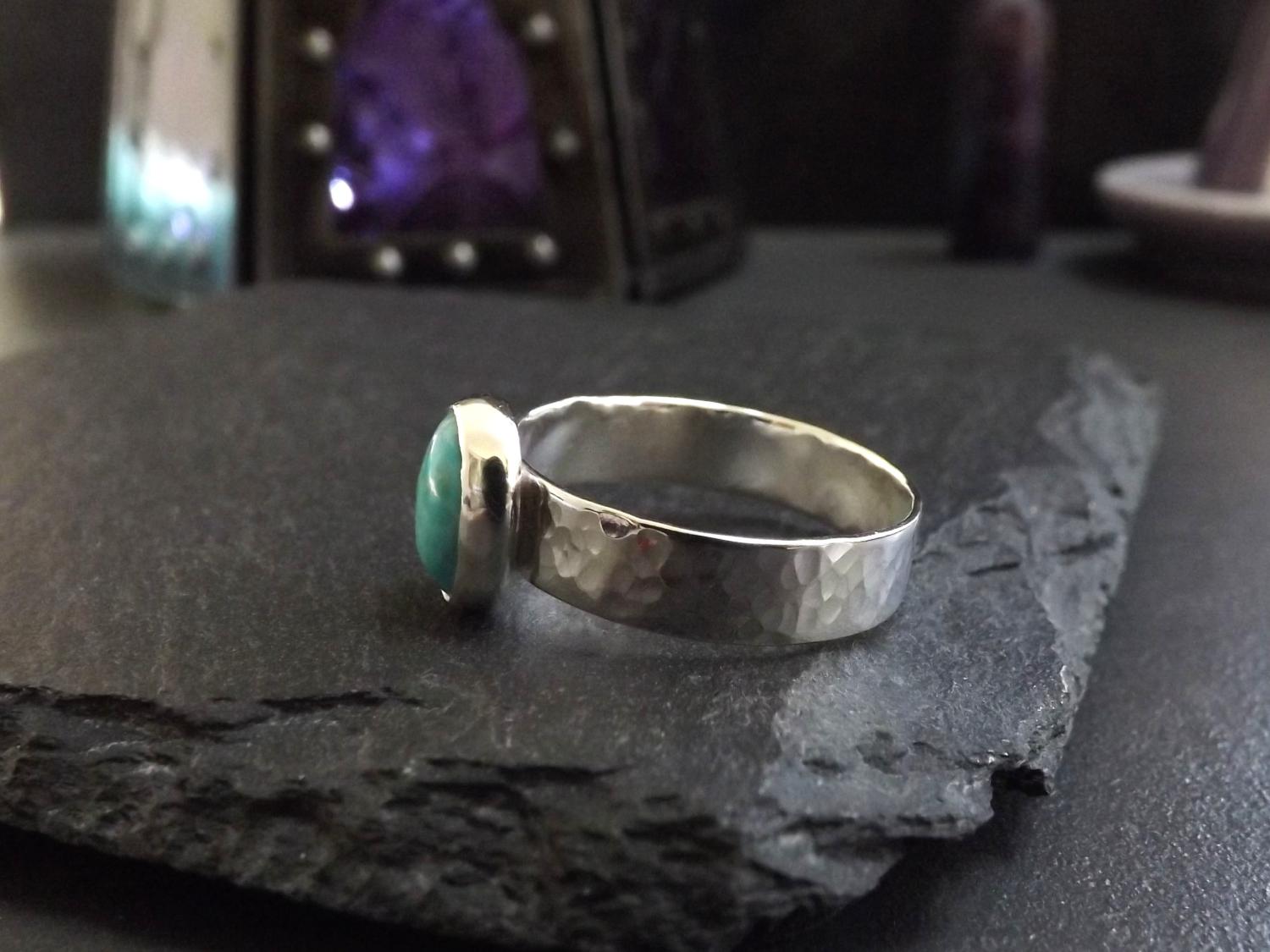 A gorgeous natural turquoise gemstone wrapped in recycled sterling silver and mounted on a handmade hammered silver ring. The unique texture of the hammered silver creates a perfect contrast to the vibrant turquoise, making this ring both bold and refined.