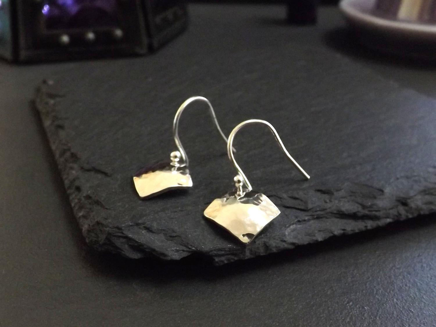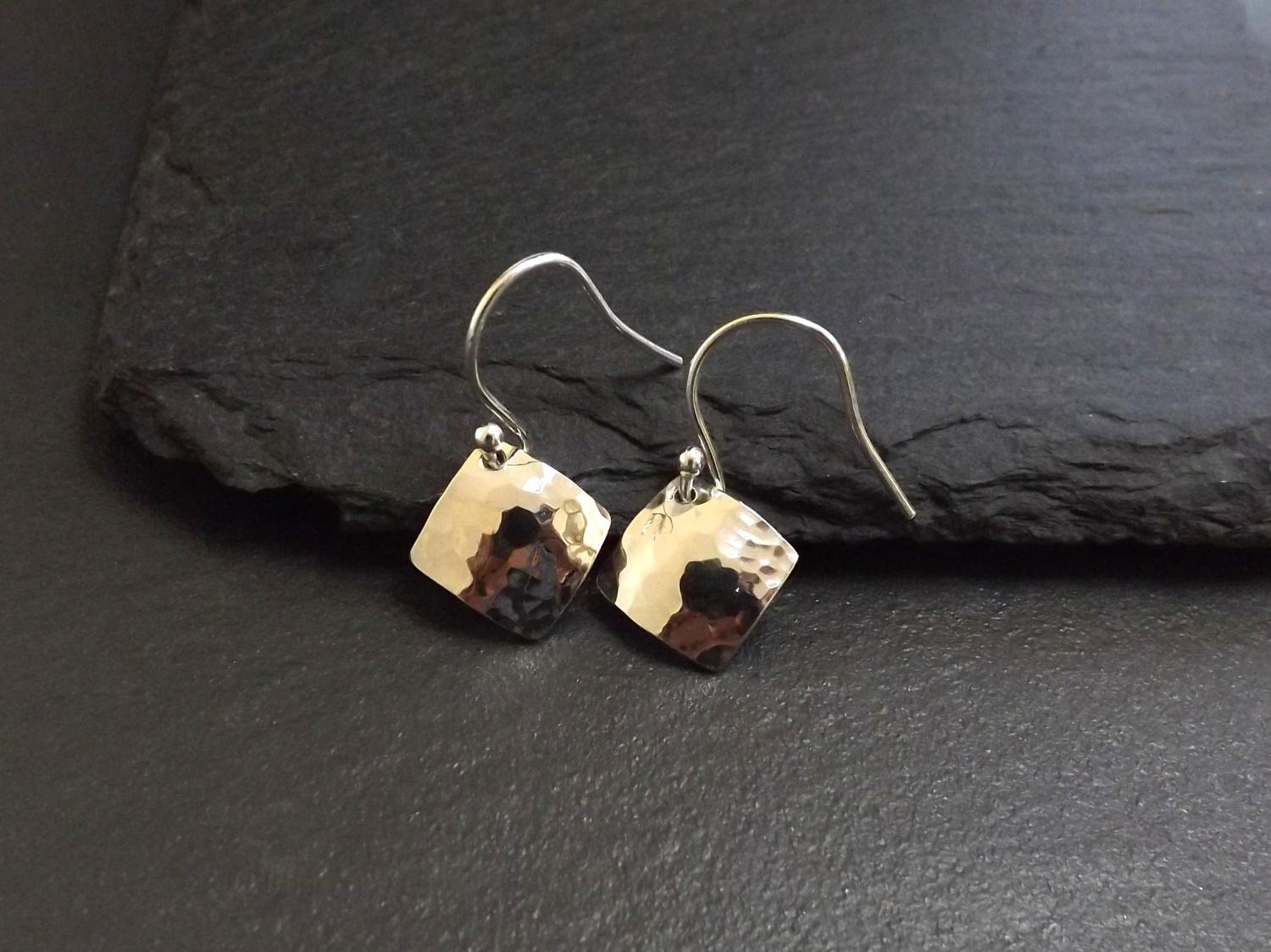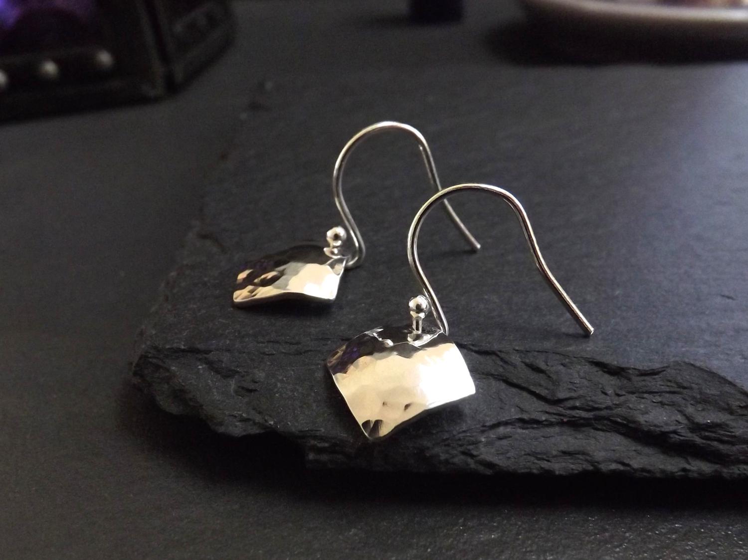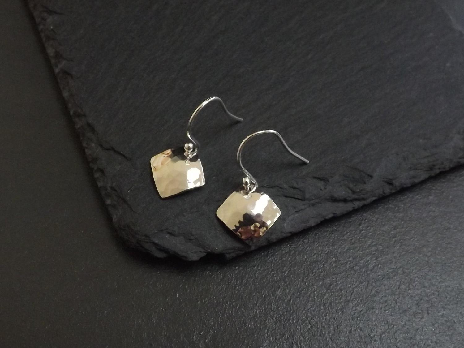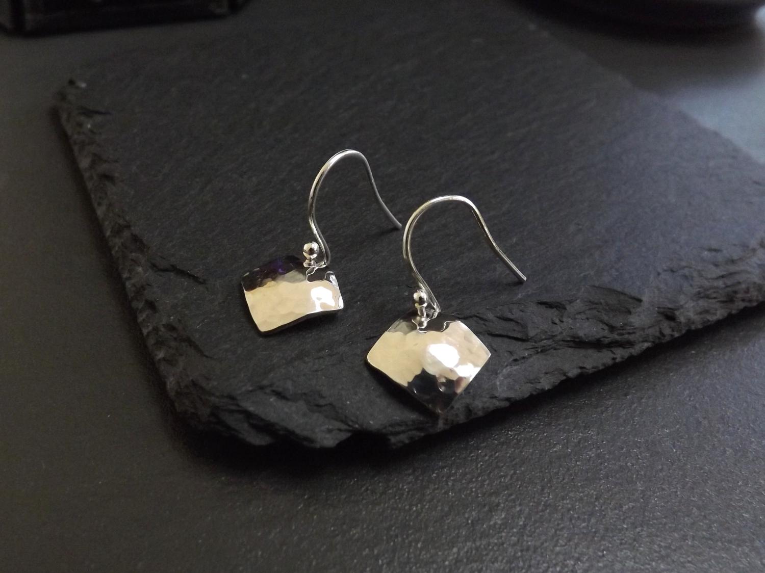 A minimalist modern design combined with a traditional hammered finish that catches the light as they dangle. These handmade hammered silver squares have been gently domed to add an extra dimension, and hung diagonally on beaded ear wires create an everyday pair of earrings, understated yet ideal for anyone who loves something handmade to match their unique style.