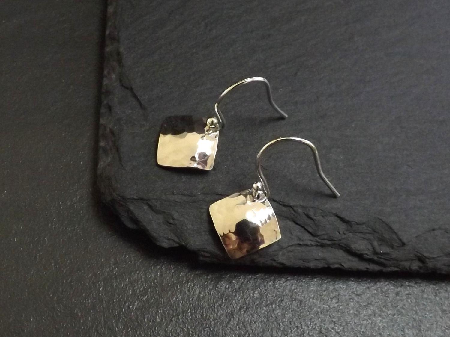 Hand made using traditional methods. The squares were cut from sheet sterling silver using a piercing saw. They were then filed and sanded with abrasive paper to smooth the edges and remove scratches. Holes were drilled and they were polished before adding the texture with a hammer, followed by doming them. Lastlyy they were hung on their sterling silver ear wires.