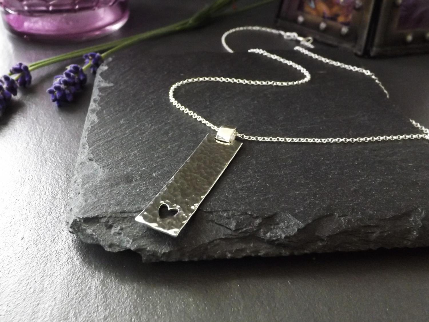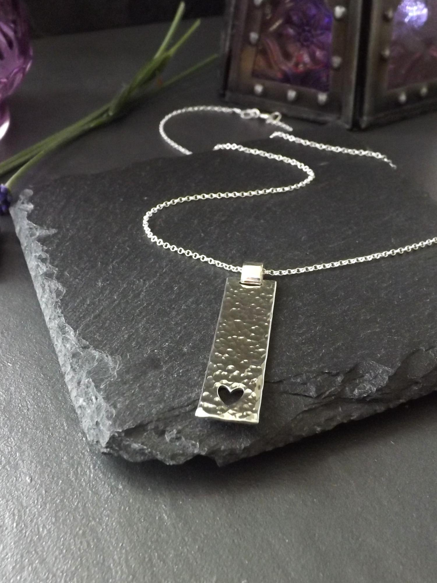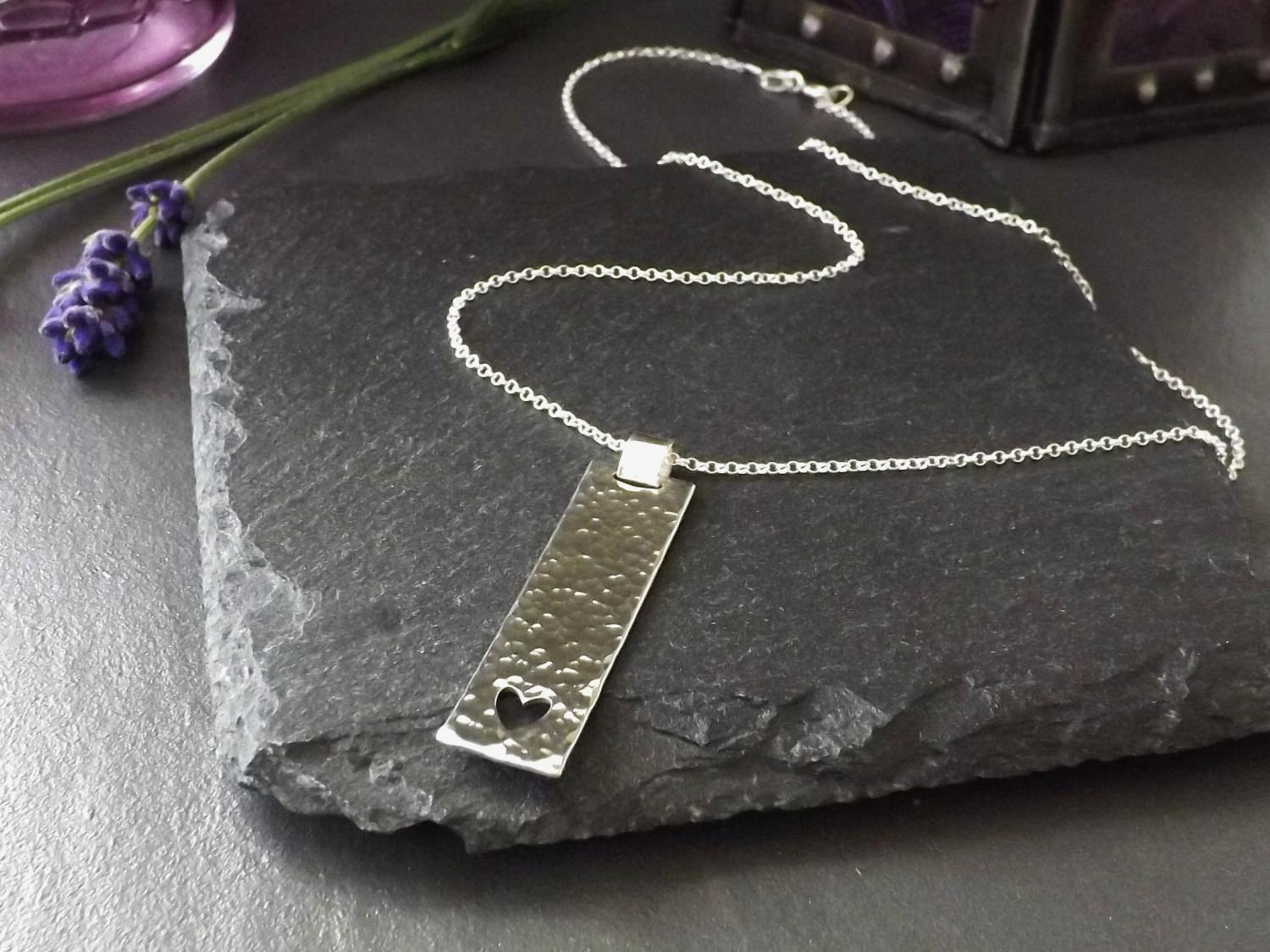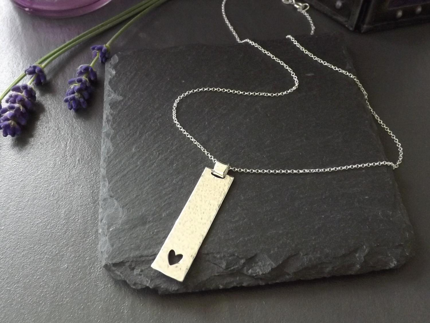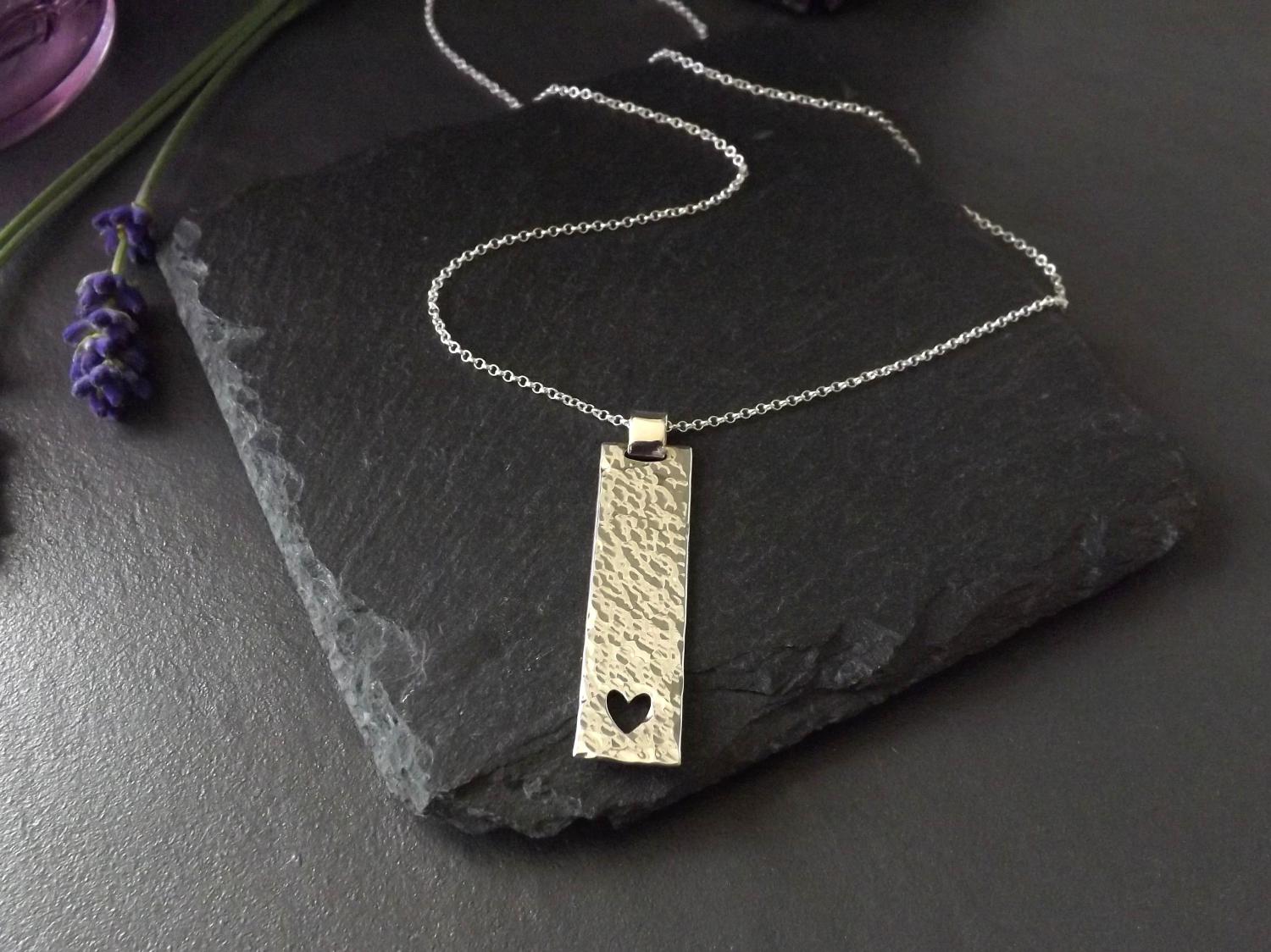 Make a meaningful statement with this unique, handmade silver pendant, featuring a beautifully hammered texture and a saw-pierced heart design. Crafted from recycled sterling silver, this pendant makes a perfect gift to express love or as a cherished addition to your own jewellery collection. The rectangular pendant is crafted with care and hangs effortlessly from its chain to allow the minimalist design to grace your neckline, its hammered finish reflecting light in all the right ways, ensuring this pendant stands out, whether worn casually or for a special occasion.