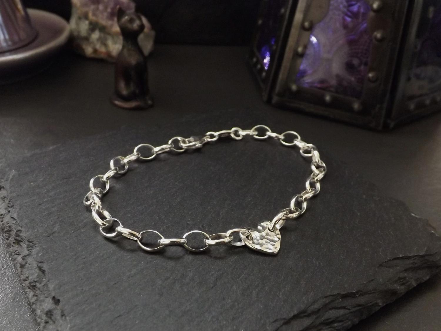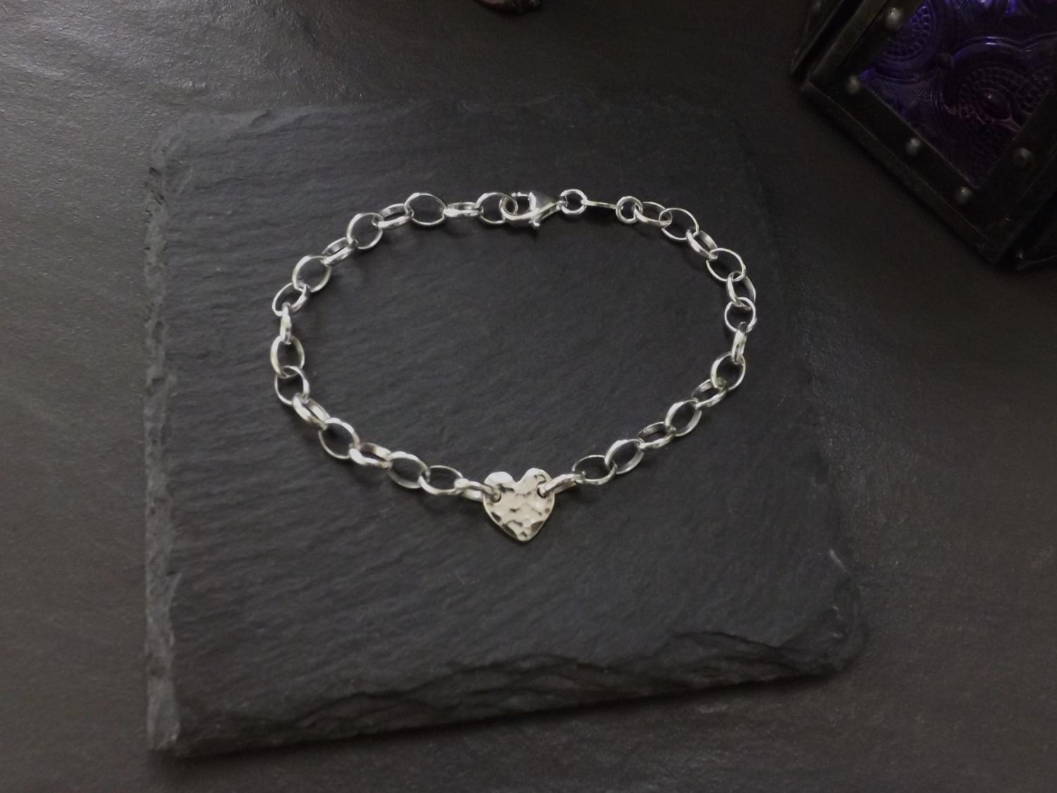 For those who like to show their feelings, this little love heart bracelet is a charming choice. A handmade silver heart, textured by hammering, and attached to a chunky belcher chain silver bracelet, secured by a lobster clasp.
