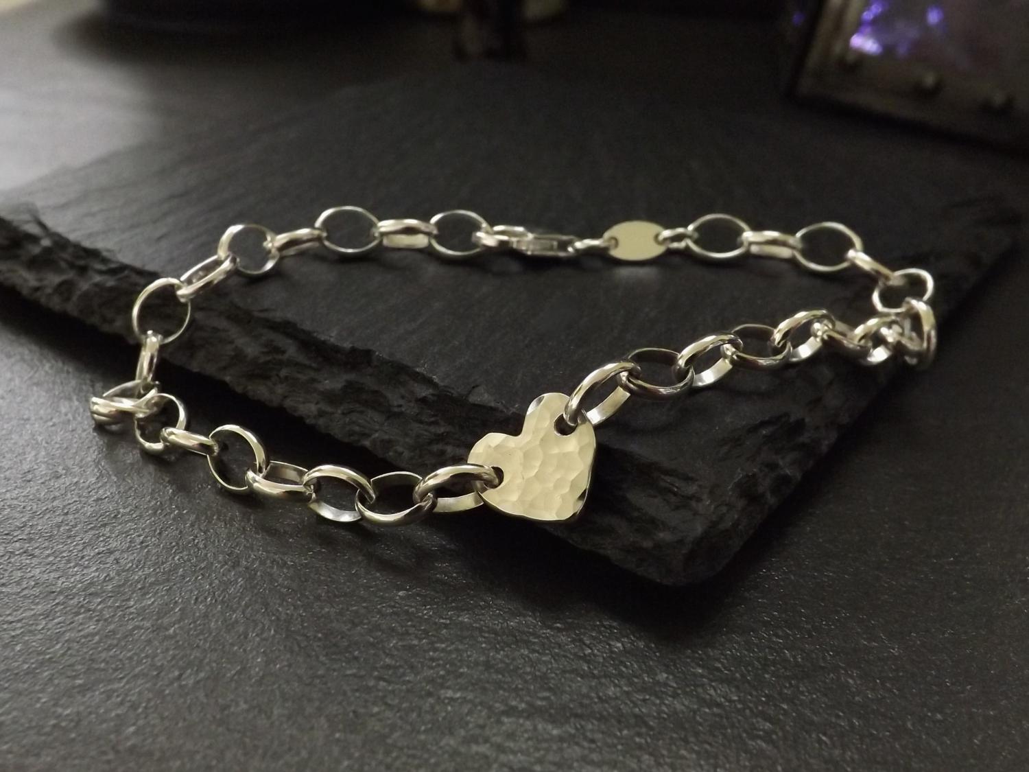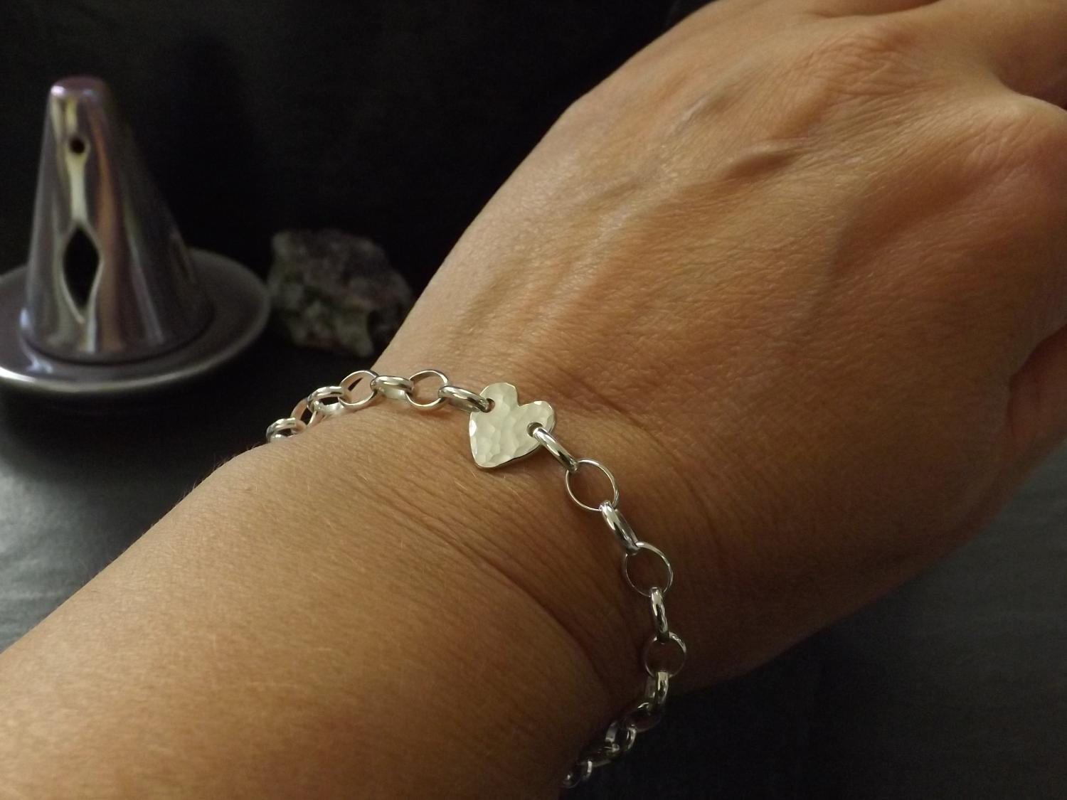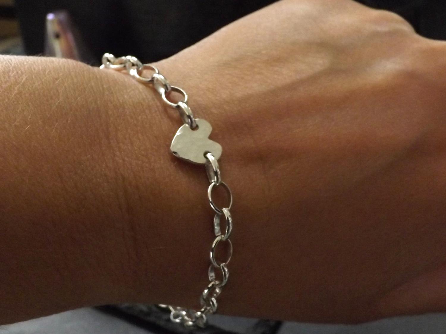 Made using traditional silversmithing techniques. The heart shape was sawn from a sheet of silver and two holes were drilled. The piece was filed and sanded before attaching it to the bracelet chain. The links either side of the heart were soldered in place to ensure the security of the bracelet. Lastly the bracelet was cleaned and polished.