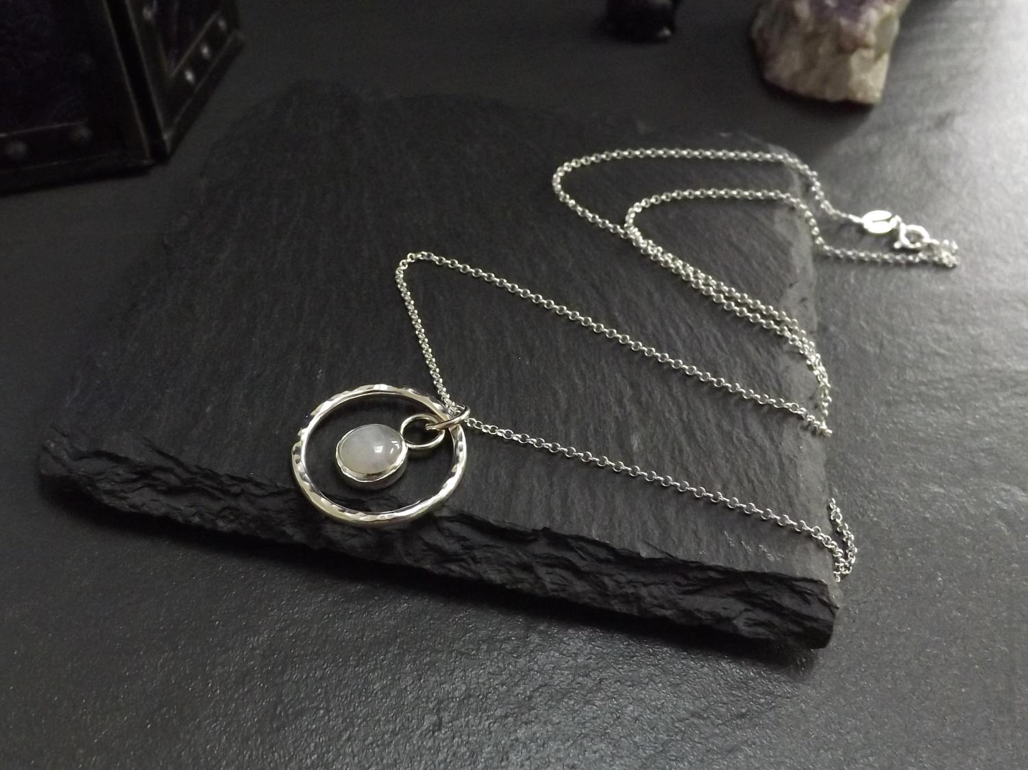 Moonstone in Hammered Silver Circle Pendant Necklace