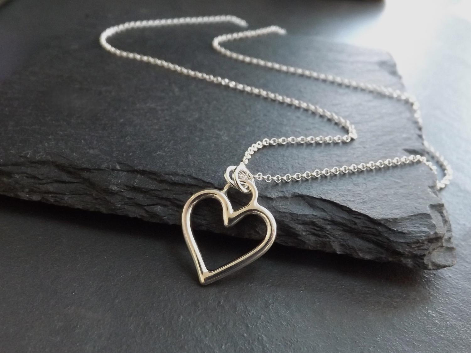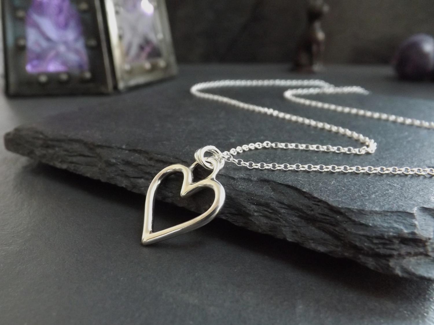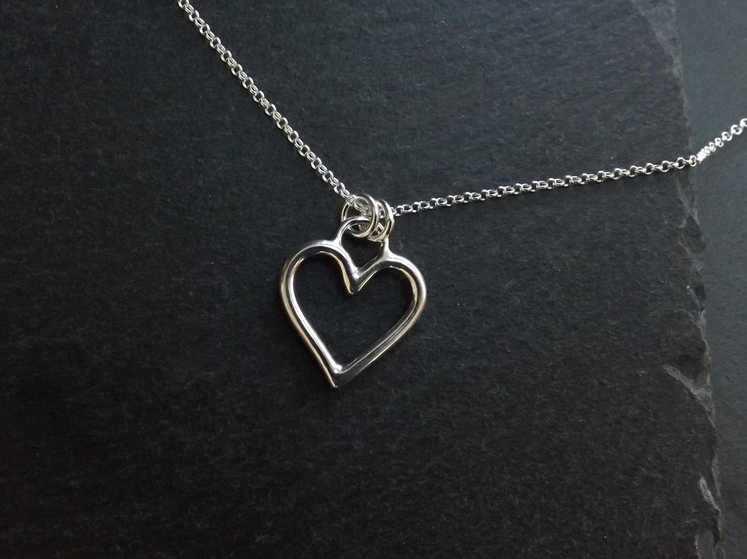 A simple design full of meaning. This handmade sterling silver heart pendant features smooth curves and clean lines, creating a modern yet timeless piece of jewellery. The open heart, formed from thick silver wire and polished to shine, is suspended on a sterling silver chain. A beautiful necklace for those who appreciate elegance and sentiment in their jewellery.