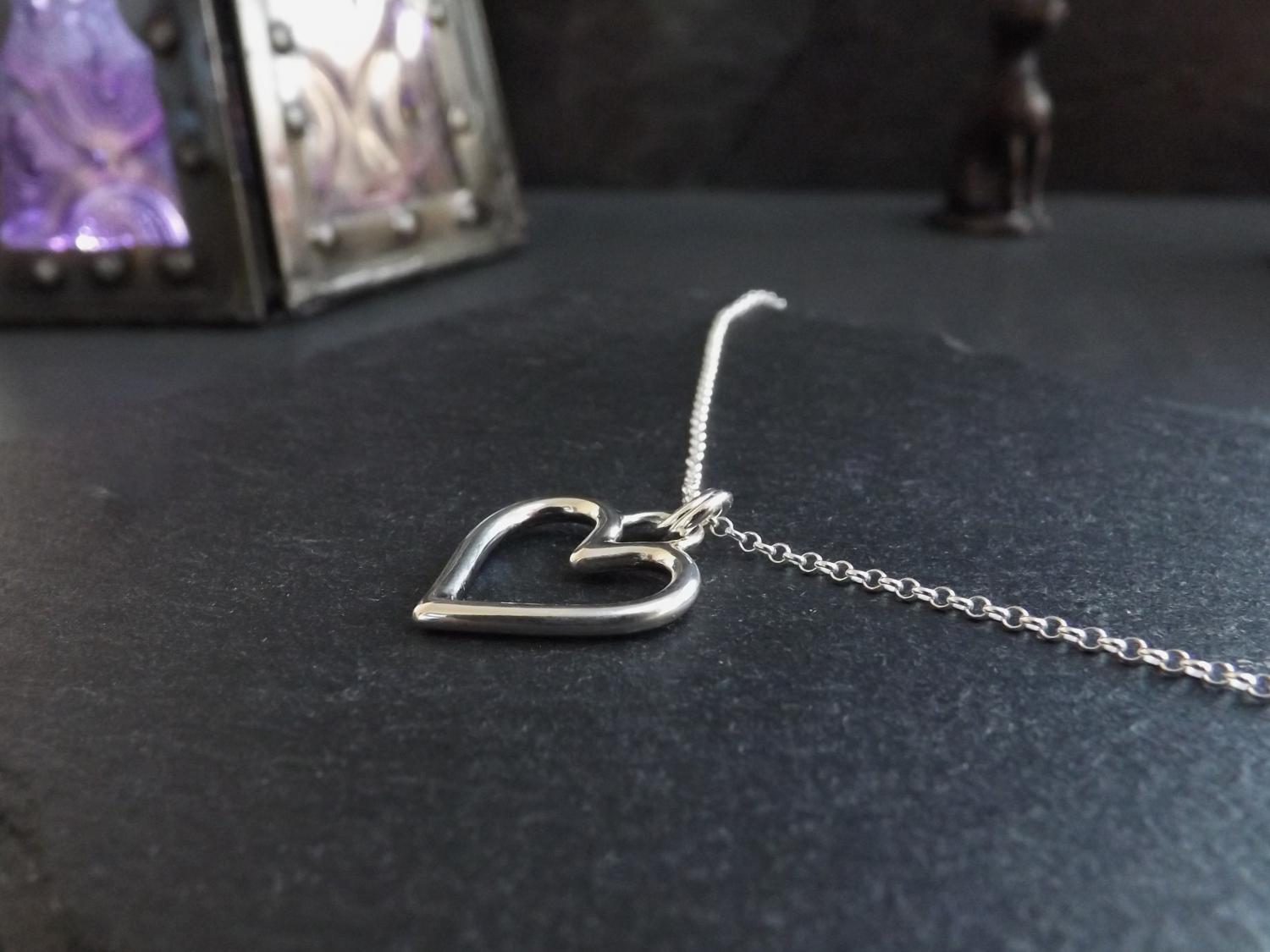 Handcrafted using traditional silversmithing techniques. The heart was formed from a length of thick sterling silver wire, cut into two pieces then shaped to make the two halves of the heart and then soldered together. A smaller curved piece of wire was then soldered to the top. The piece was placed in a warm pickle solution to help clean it and remove any fire scale caused by the blowtorch. The pendant was then filed, sanded and polished before adding jump rings and hanging it on its chain.