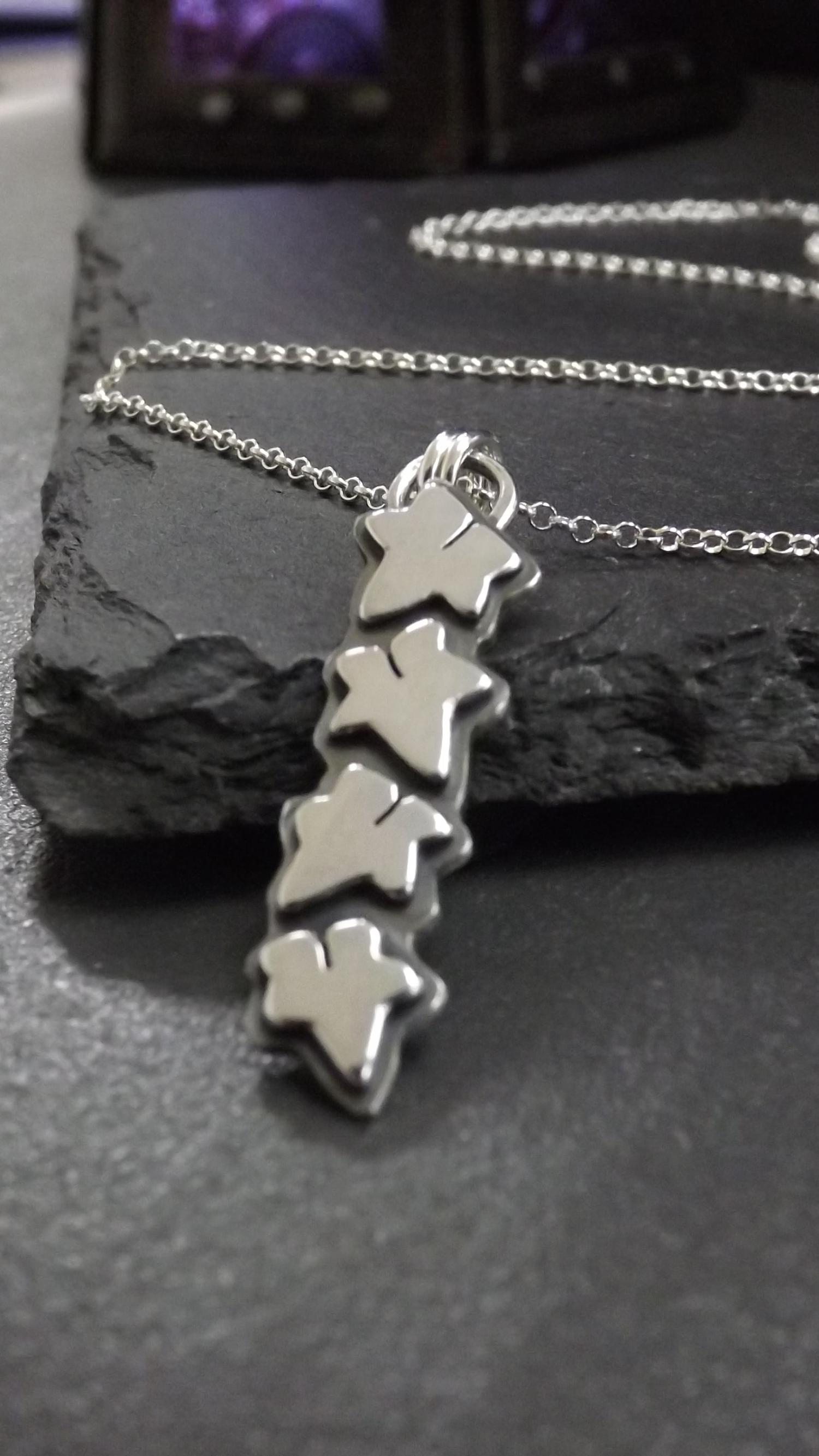 Perfect for nature lovers, this handmade silver necklace features four hand-cut silver ivy leaves, its design a modern twist on an Art Nouveau vibe. Beautiful little ivy leaves made of silver. A unique pendant on a sterling silver belcher chain. Please select your preferred chain length below.