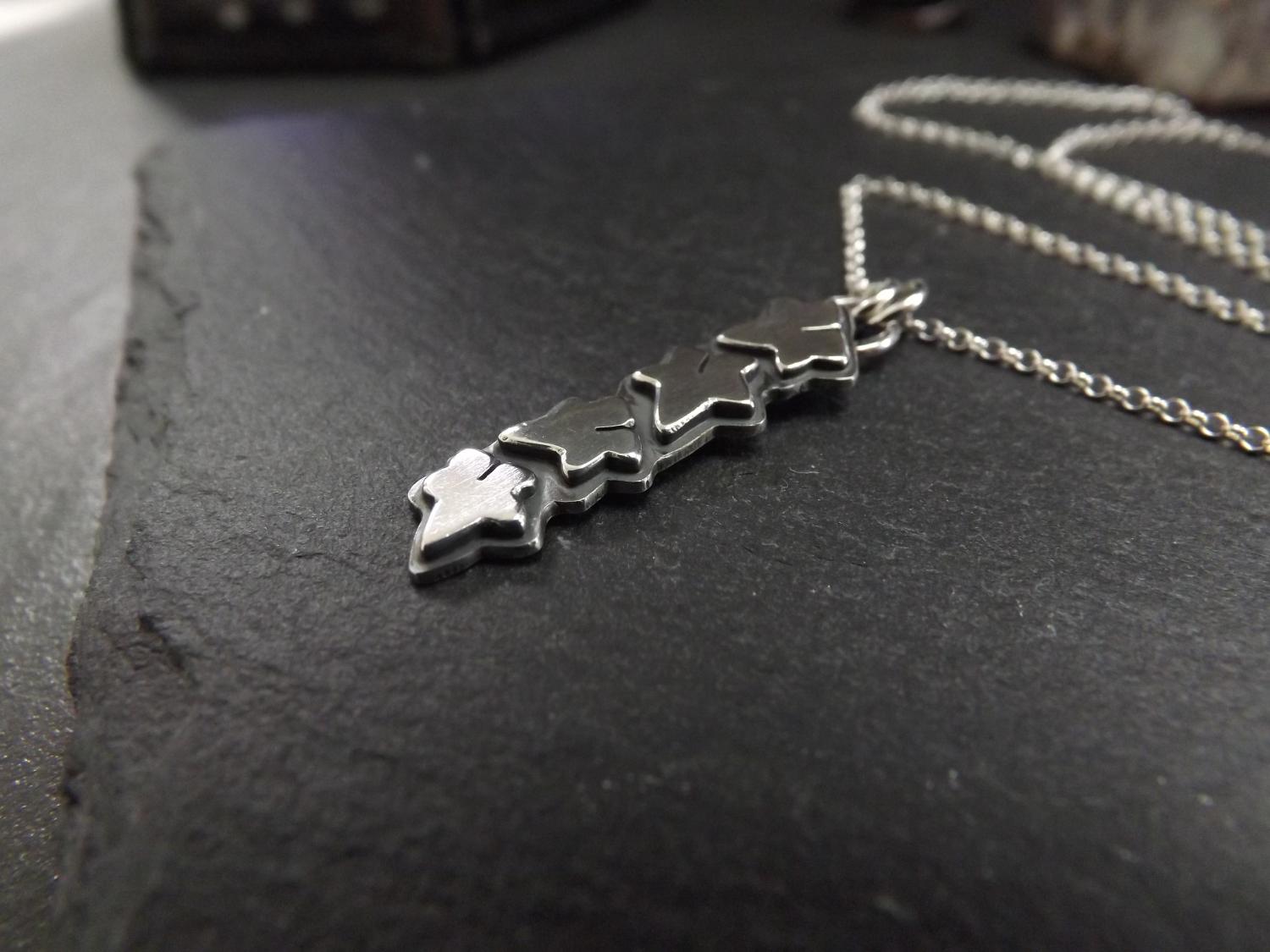 Handmade using traditional silversmithing methods. First the ivy leaves were drawn freehand onto a sheet of sterling silver and cut out with a piercing saw. The edges were filed and sanded using five different grades of abrasive papers to smooth the edges. They were then soldered to another sheet of silver, and sawn around. Further filing and sanding followed before a jump ring was soldered to the top. The pendant was then placed in a pickling solution to help remove the fire scale caused by the blow torch. After this the piece was cleaned and polished. A patina was added to oxidise and darken the backing plate so as to highlight the shiny leaves.